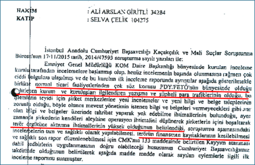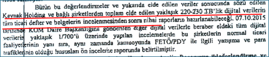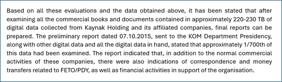 As a matter of fact, the statement on page 2 of the decision of the Criminal Judgeship of Peace that ‘…approximately 220-230 TB of digital data, all commercial books and documents obtained in total from the aforementioned Kaynak Holding and its affiliated companies…’ clearly reveals that this situation is also accepted by the Judgeship. In the decision of the Judgeship, it is stated that these documents continue to be analysed.
