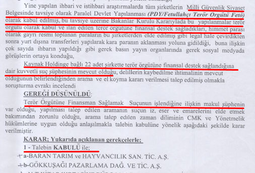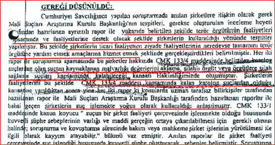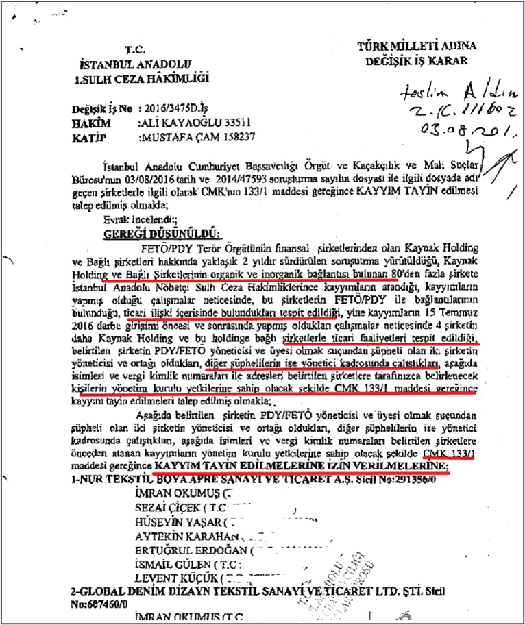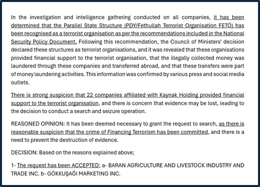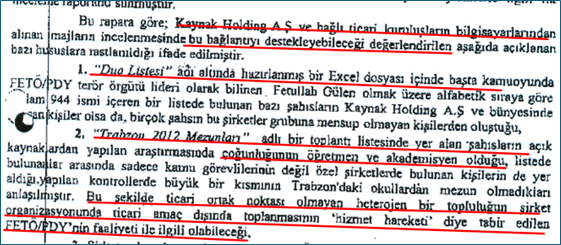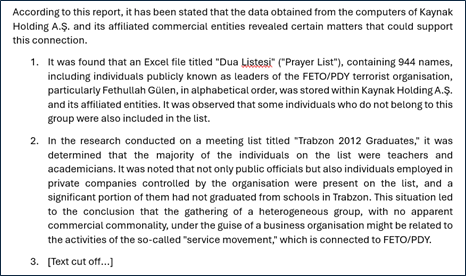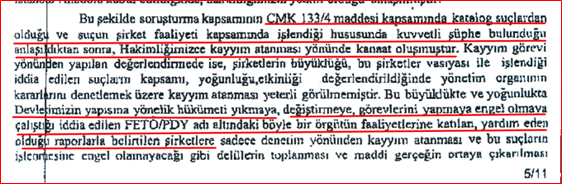 - As a matter of fact, in the concrete case, no offence committed ‘within the scope of the company’s activity’ was shown in the judge’s decision. All of the events shown in the decision within the scope of the offence ‘within the framework of company activity’ are individual events that are not ‘within the scope of company activity’. For example, it is mentioned that a ‘prayer list’ containing 944 names was found in the ‘examination of the images taken from the computers of Kaynak Holding and affiliated commercial organisations’, and this was cited as a justification for the decision to ‘appoint a trustee’ (page 1).