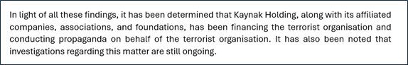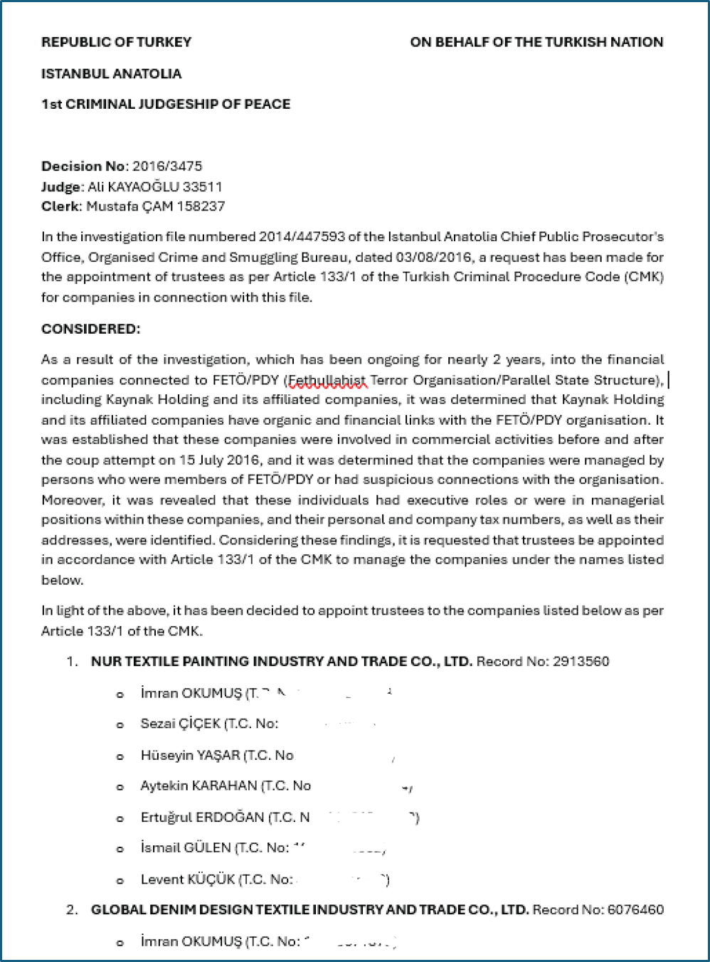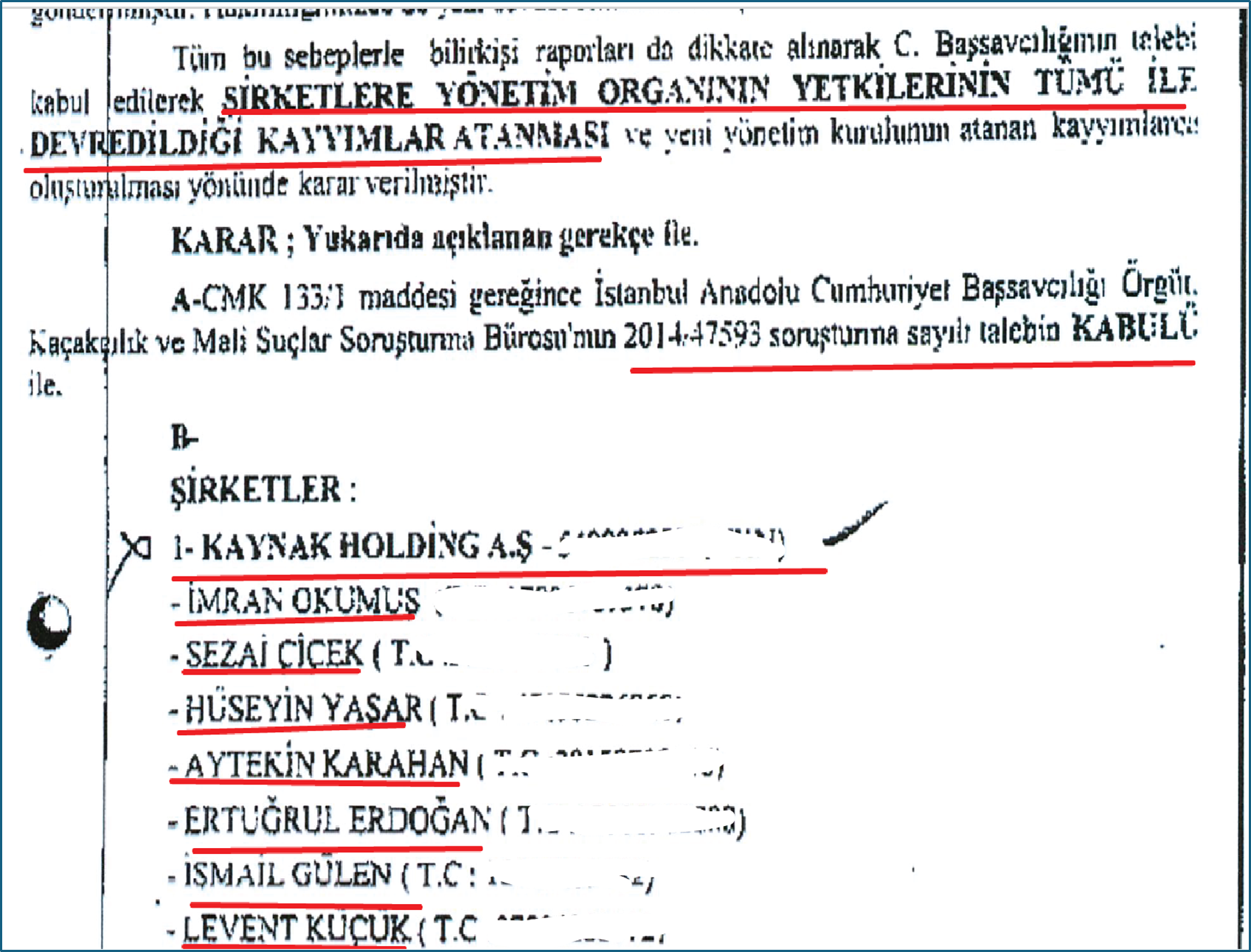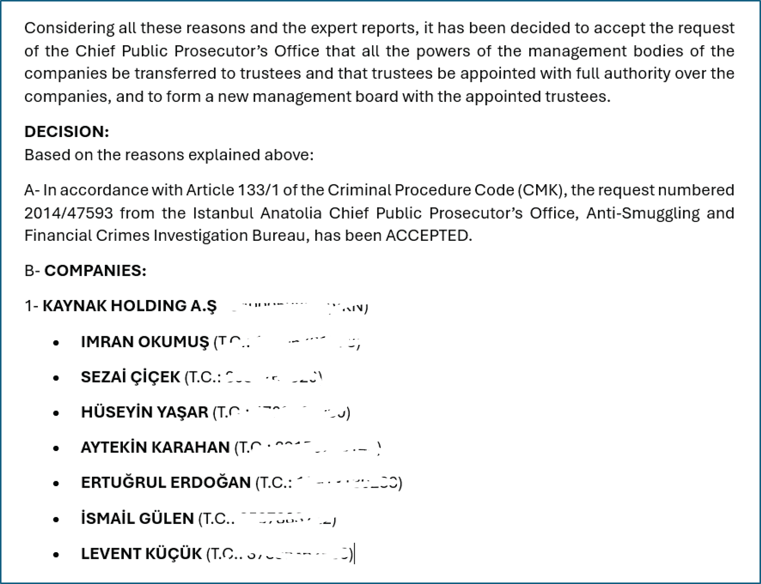 - Following the appointment of a trustee to Kaynak Holding by the Criminal Judgeship of Peace in November 2015, the criminal case was heard at Istanbul 33rd Heavy Criminal Court. With its decision dated 03.07.2023, Istanbul 33rd Heavy Criminal Court ruled for the confiscation of Kaynak Holding and 25 affiliated companies pursuant to Article 54/1 of the Turkish Penal Code. This decision was also approved by the Court of Appeal. The file is pending at the Criminal Chamber of the Court of Cassation for the final decision. When this process is taken into consideration, it is seen that Kaynak Holding and the companies within its structure have been de facto taken from the ownership of its shareholders and owners for about 10 years, seized by the Turkish state without compensation, the objections made have no equivalent in the legal order, and the practice of appointing trustees to companies regulated by Article 133 of the Criminal Procedure Code has been transformed into a weapon used against those who oppose the Erdoğan government.