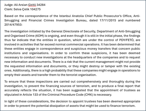 o The process of appointing trustees to companies allegedly linked to the Gülen movement does not comply with national and international legal norms. These decisions were not based on objective legal rules, but on political motivations.