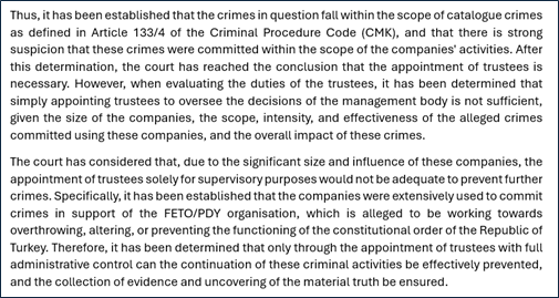 Although we believe that there are no conditions for the appointment of a supervisory trustee, in the concrete case, no justification in accordance with the principle of proportionality has been shown as to why the management of the companies has been transferred to the trustee instead of the appointment of an ‘approving trustee’, which restricts rights and freedoms less. However, it is inconceivable that 19 companies operating in tens of sectors, consisting of a gigantic structure with over 8000 employees, hundreds of branches and stores throughout Turkey and operating in tens of sectors, can be managed by seven people who do not know the companies at all. Therefore, the principle of proportionality was clearly violated in the Judge’s decision. In the judge’s decision, it is justified that ‘the appointment of a supervisory trustee would be insufficient for the collection of evidence’. However, neither the ‘’managing trustee ‘’ nor the ‘’supervisory trustee ‘’ has the duty and authority to collect evidence. Prof. Dr. Sami Selçuk has clearly demonstrated the fallacy of this justification: ‘It should not be forgotten that trustees must be impartial. Therefore, the trustee must not have any relationship with the prosecution and defence. It should also be noted that a trustee is not a ‘secret investigator’ (Art. 139). Therefore, the trustee has – or can have- no duty to investigate and collect evidence.’