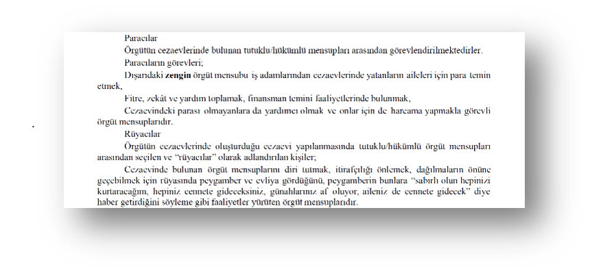 - In the second section titled ‘Current Structuring of the FETÖ/PDY Armed Terrorist Organisation’, reference is made to the information notes left in the electronic information repository (EBYS) of the police by the TEM Department of the General Directorate of Security, and the ‘current structuring (sacrifice group, student structuring, serdengeçti, ibn-i erkam, ghost structuring, dreamers etc.)’ and subjective evaluations and fabricated information such as “organisational finance supply (marketer envelope, monthly salary envelope etc.)” or “organisational communication style (signal, viber, telegram, League of Legends game etc.)”;