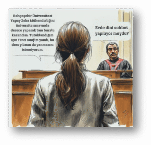The Underage Girls Case, which was heard in the last week of September, constituted a very interesting example of the circular evil mentioned above. During the trial in question, it was not the “terrorist(!) acts of a new(!) organisation established with the aim of overthrowing the constitutional order” that came to the fore, but the “routine of female students” that was the subject of the Law Enforcement Investigation and the Prosecution Indictment. In the courtroom, girls were asked about social activities such as studying, bowling or going to the cinema, as well as routine religious practices such as praying, breaking the fast, and reading the Qur’an. Lale Demirkazan, one of the lawyers in the case, shared in her X message that the accusations against A.Z., an 18-year-old student at Istanbul Law Faculty, were “staying in a student-shared house, going to the cinema at Perla Vista Shopping Mall and ordering food from Yemek Sepeti“. Another lawyer, Hatice Yıldız, stated that the most frequently used words in the courtroom were “Qur’an, prayer and juz (20-page sections in Qur’an)“, and wrote that the statement of one of the girls, “I did not think that the prayers I prayed would one day appear before me as a terrorist offence”, was entered into Segbis records in 2024 Turkey.