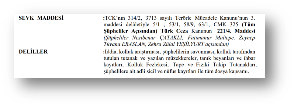 The Prosecutor’s Indictment in this case, which targets 41 people in total, includes “Articles 314/2 and 221/4 of the Turkish Penal Code, Articles 3, 5/1, 53/1, 58/9, 63/1 of the Anti-Terror Law and Article 325 of the Code of Criminal Procedure” in the referral article of the offence, and states that the evidence consists of “allegations, law enforcement investigations, the defence of the suspects, minutes and warrants written by the law enforcement, witness statements, denunciation records, law enforcement proceedings, tape and physical surveillance reports, criminal and civil registry records of the suspects and the entire file scope”. Within the scope of the investigation file in question, the allegations of the Law Enforcement Office and the Prosecutor’s Office consisted of “the opening of four student houses on the European side of Istanbul, the accommodation of female students in these houses, the organisation of a camping programme for students in Akören Village and the planning of a day trip to Bursa province”. During the investigation process initiated on the basis of these allegations, the law enforcement mobilised all its means and followed the girls, including those under the age of 18, for months, and finally identified 116 acts(!) and ensured that they were included in the Prosecutor’s Indictment.