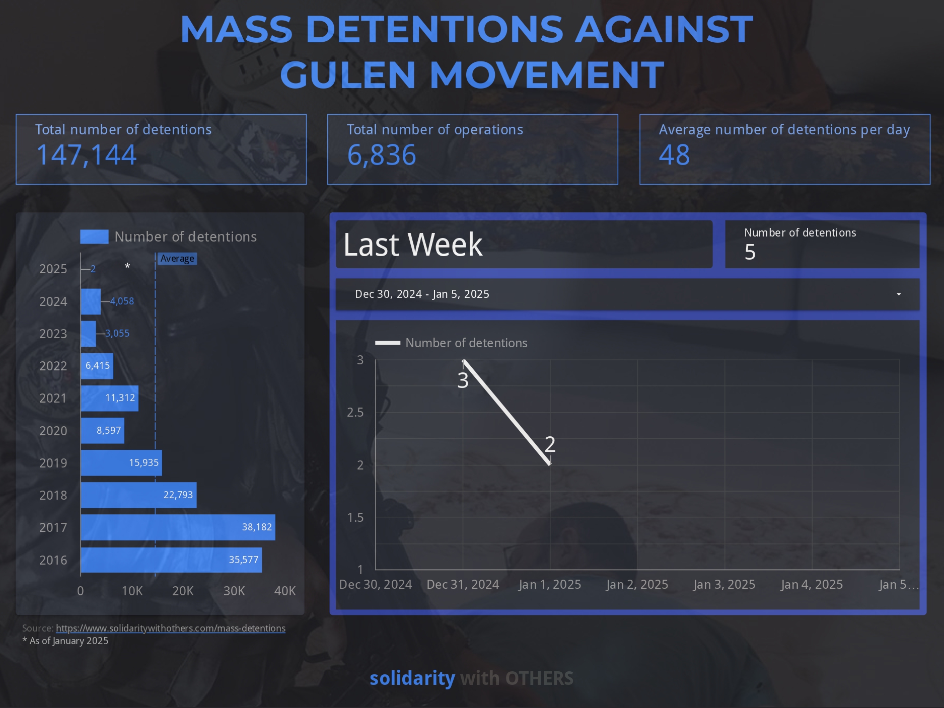Throughout the week, prosecutors ordered the detention of at least 5 people over alleged links to the Gülen movement. In October 2020, a UN Working Group on Arbitrary Detention (WGAD) opinion said that widespread or systematic imprisonment of individuals with alleged links to the group may amount to crimes against humanity. Solidarity with OTHERS has compiled a detailed database to monitor the Gülen-linked mass detentions since a failed coup in July 2016.