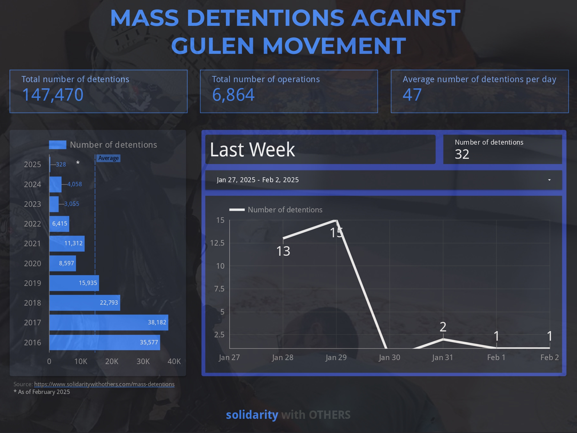 Throughout the week, prosecutors ordered the detention of at least 32 people over alleged links to the Gülen movement. In October 2020, a UN Working Group on Arbitrary Detention (WGAD) opinion said that widespread or systematic imprisonment of individuals with alleged links to the group may amount to crimes against humanity. Solidarity with OTHERS has compiled a detailed database to monitor the Gülen-linked mass detentions since a failed coup in July 2016.