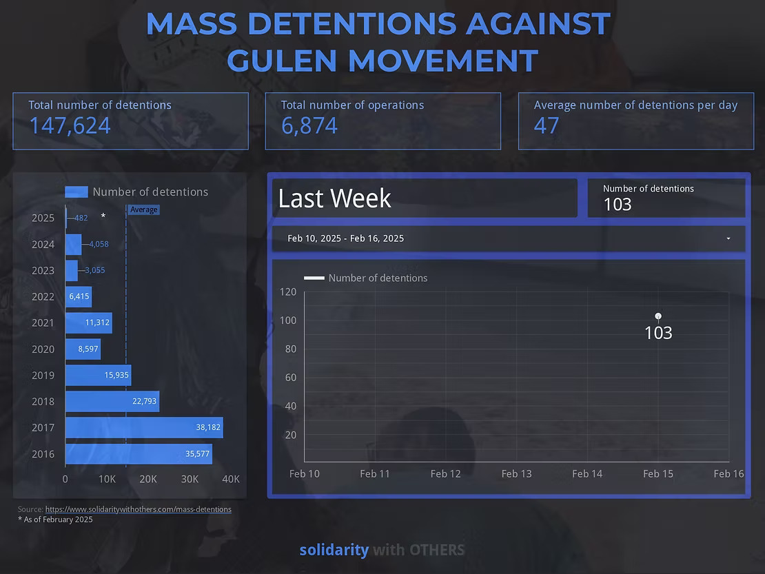 15 February: Turkish authorities have detained 103 people across 39 provinces in the past week over alleged ties to the Gülen movement, Interior Minister Ali Yerlikaya announced, despite a landmark ECtHR ruling rejecting key evidence used in such prosecutions, as the government continues its decade-long crackdown on the movement.