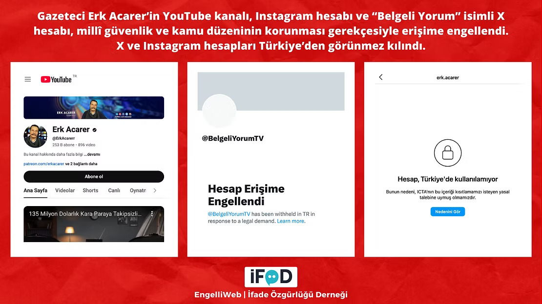 12 June: Exiled investigative journalist Erk Acarer’s YouTube channel with 253,000 subscribers, along with his “Belgeli Yorum” accounts on X and Instagram, have been blocked in Turkey on national security and public order grounds.