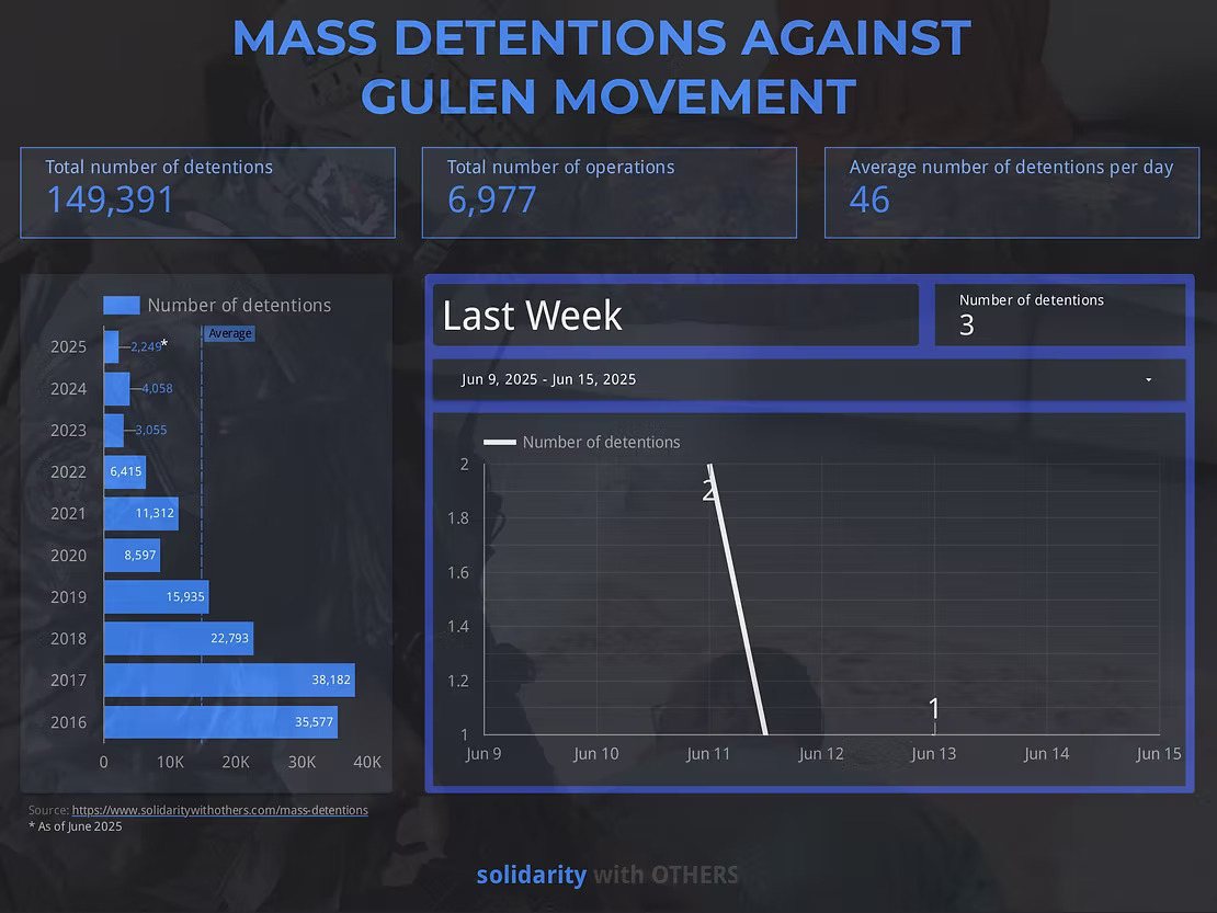 Throughout the week, prosecutors ordered the detention of at least 3 people over alleged links to the Gülen movement. In October 2020, a UN Working Group on Arbitrary Detention (WGAD) opinion said that widespread or systematic imprisonment of individuals with alleged links to the group may amount to crimes against humanity. Solidarity with OTHERS has compiled a detailed database to monitor the Gülen-linked mass detentions since a failed coup in July 2016.