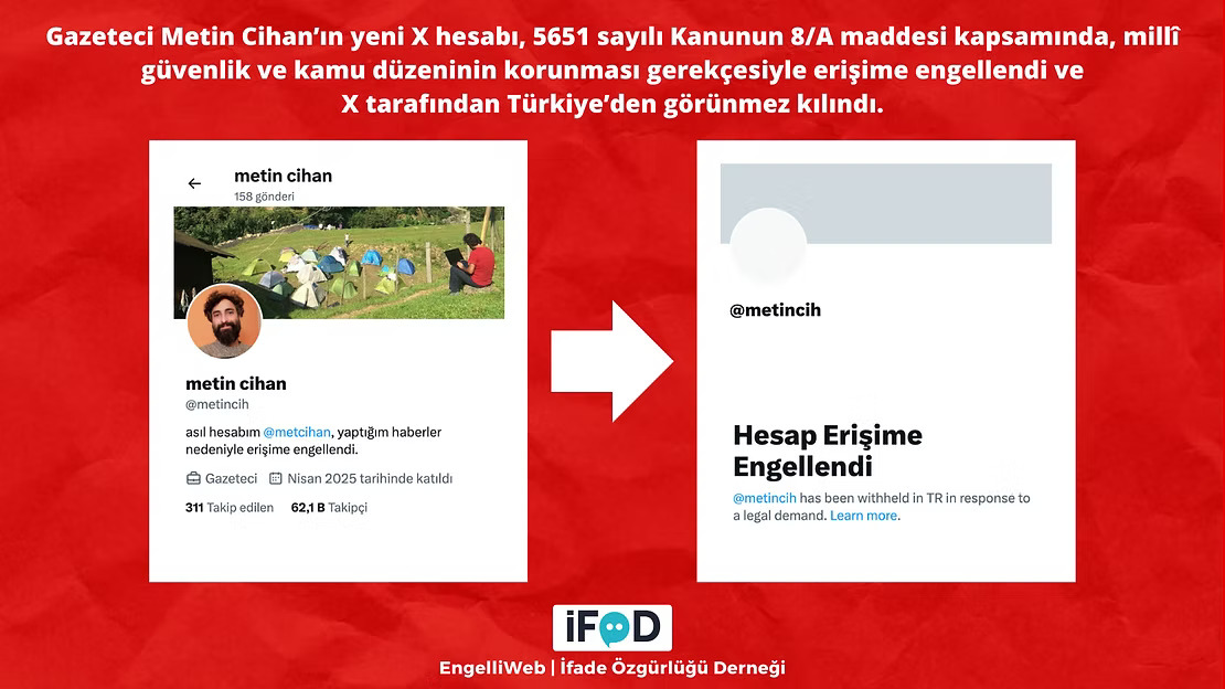 16 June: Turkish investigative journalist Metin Cihan, known for his exposés on government-linked activities including continued Turkish-Israeli trade during the Gaza conflict, has had both his X accounts—“metcihan” and “metincih”—blocked in Turkey on national security and public order grounds.
