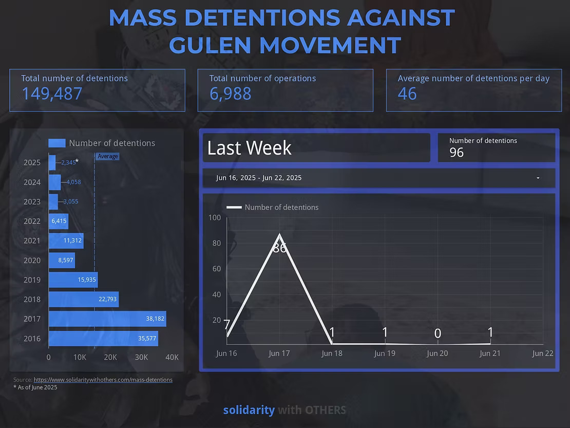 Throughout the week, prosecutors ordered the detention of at least 96 people over alleged links to the Gülen movement. In October 2020, a UN Working Group on Arbitrary Detention (WGAD) opinion said that widespread or systematic imprisonment of individuals with alleged links to the group may amount to crimes against humanity. Solidarity with OTHERS has compiled a detailed database to monitor the Gülen-linked mass detentions since a failed coup in July 2016.