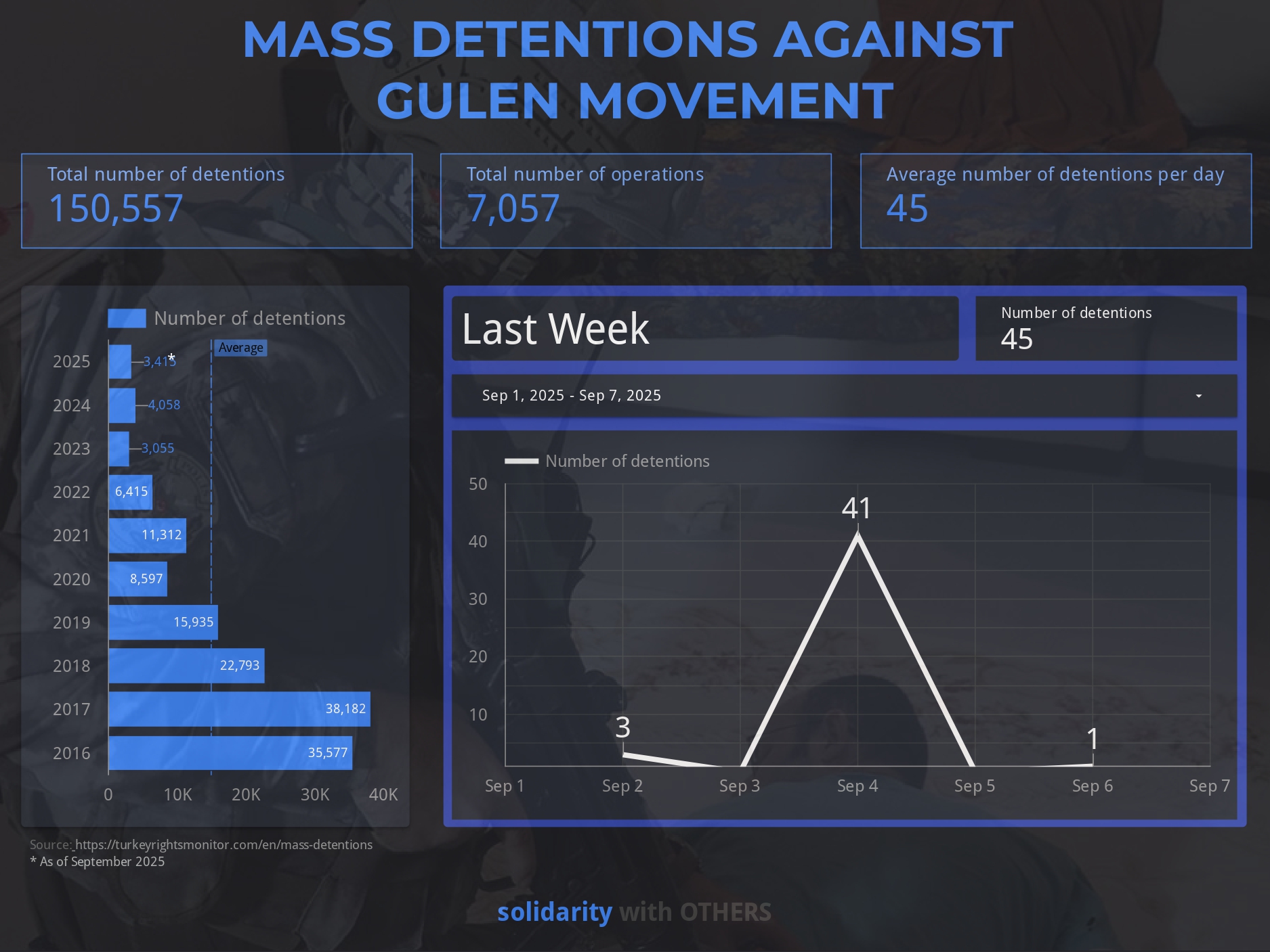 5 September: Turkish authorities detained 41 people in nationwide raids across 21 provinces over alleged Gülen movement ties, with 25 arrested and seven released under supervision, as part of a crackdown that has seen over 126,000 convicted and 11,085 still imprisoned since 2016.