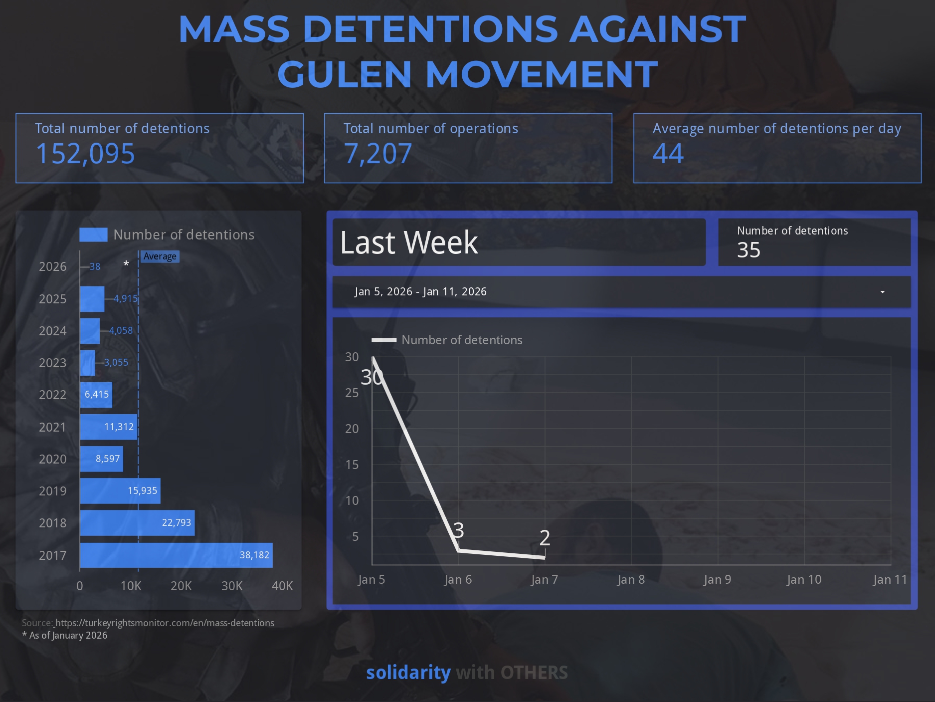 11 January: Turkish authorities detained 77 people nationwide in the past two weeks, with 43 jailed pending trial, in operations targeting alleged links to the Gülen movement, Interior Minister Ali Yerlikaya said.