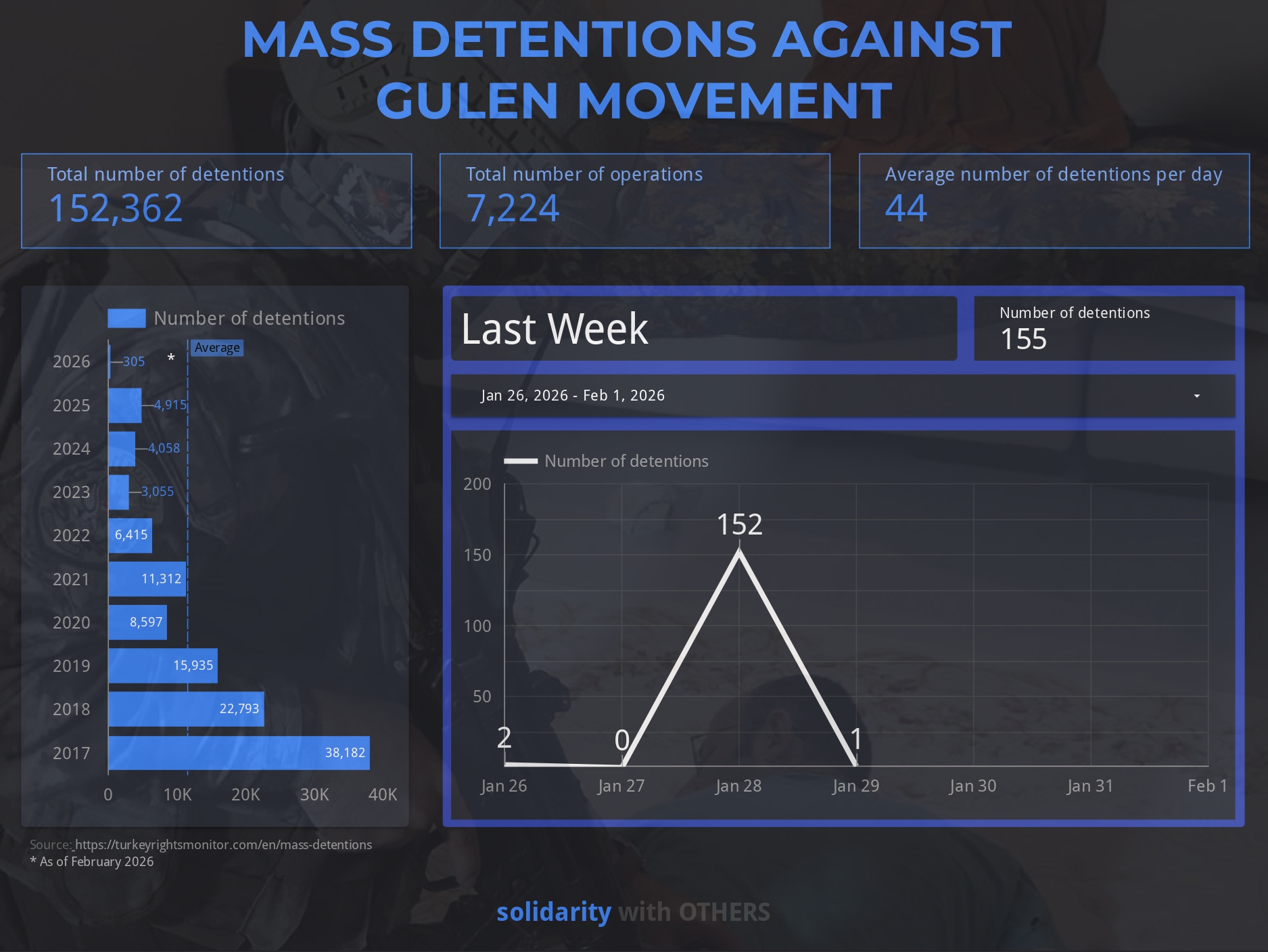 Throughout the week, prosecutors ordered the detention of at least 155 people over alleged links to the Gülen movement. In October 2020, a UN Working Group on Arbitrary Detention (WGAD) opinion said that widespread or systematic imprisonment of individuals with alleged links to the group may amount to crimes against humanity. Solidarity with OTHERS has compiled a detailed database to monitor the Gülen-linked mass detentions since a failed coup in July 2016.