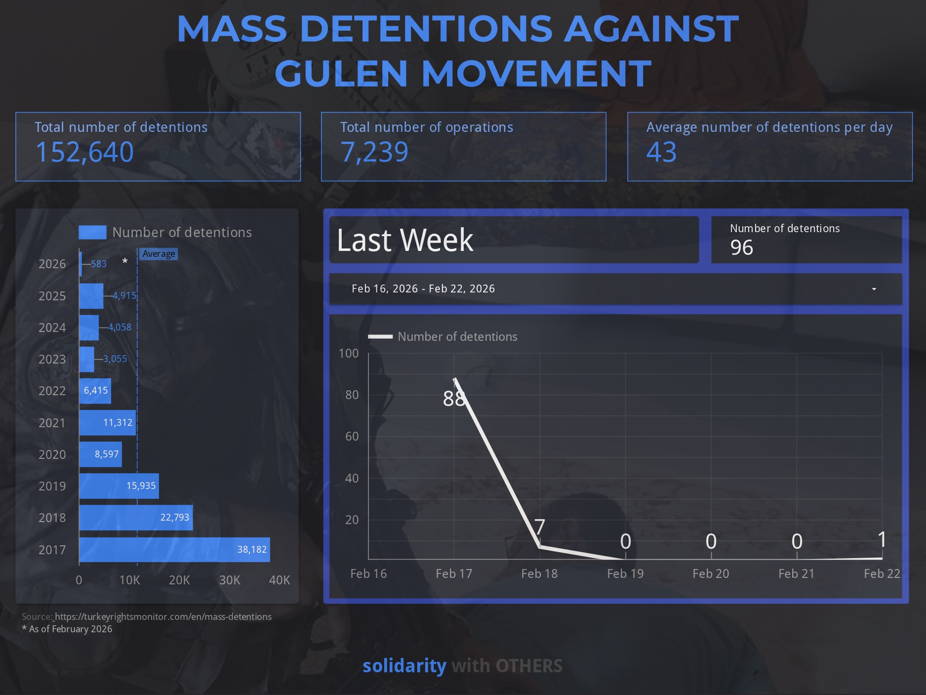 Throughout the week, prosecutors ordered the detention of at least 96 people over alleged links to the Gülen movement. In October 2020, a UN Working Group on Arbitrary Detention (WGAD) opinion said that widespread or systematic imprisonment of individuals with alleged links to the group may amount to crimes against humanity. Solidarity with OTHERS has compiled a detailed database to monitor the Gülen-linked mass detentions since a failed coup in July 2016.