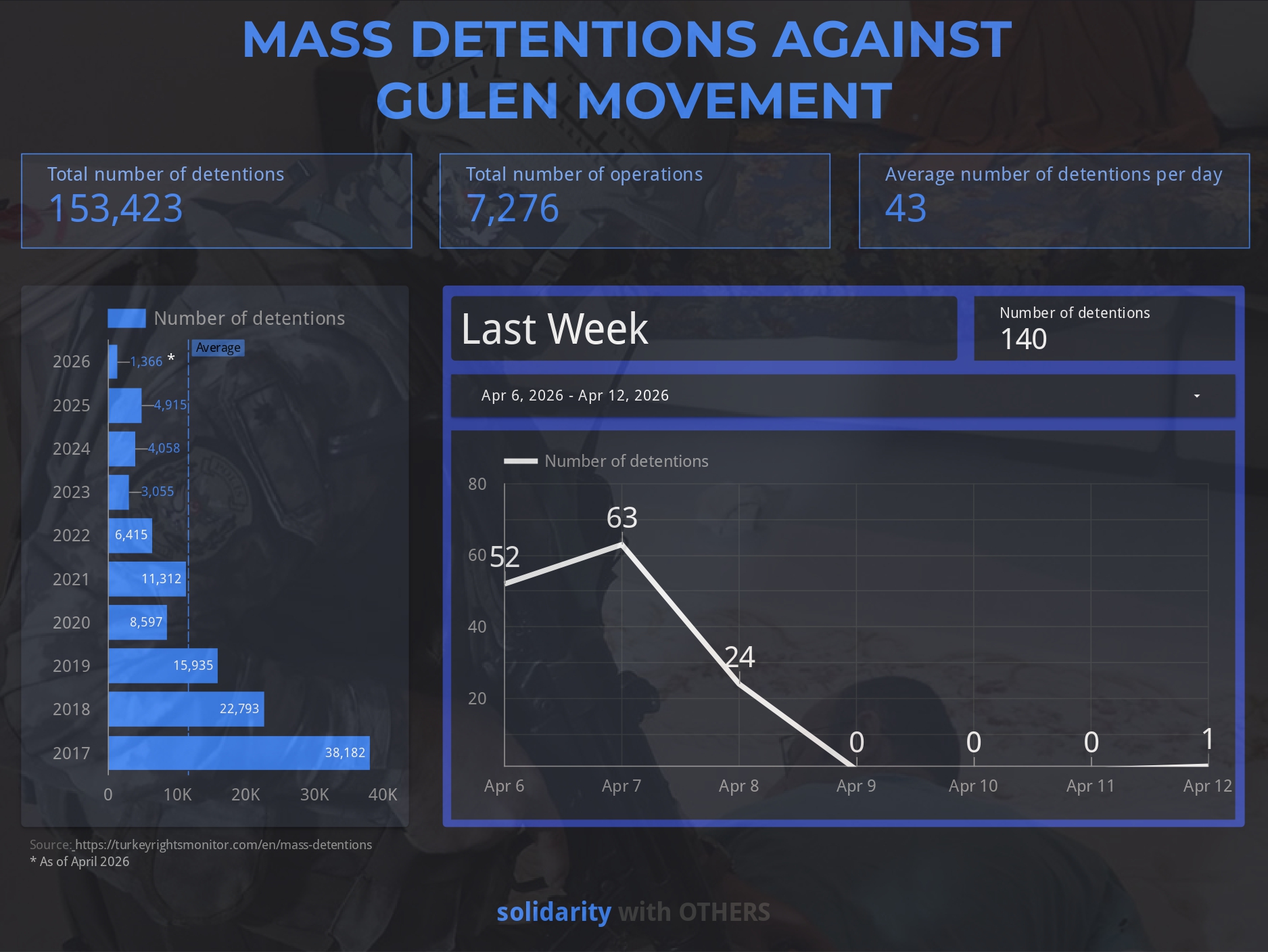 Throughout the week, prosecutors ordered the detention of at least 140 people over alleged links to the Gülen movement. In October 2020, a UN Working Group on Arbitrary Detention (WGAD) opinion said that widespread or systematic imprisonment of individuals with alleged links to the group may amount to crimes against humanity. Solidarity with OTHERS has compiled a detailed database to monitor the Gülen-linked mass detentions since a failed coup in July 2016.