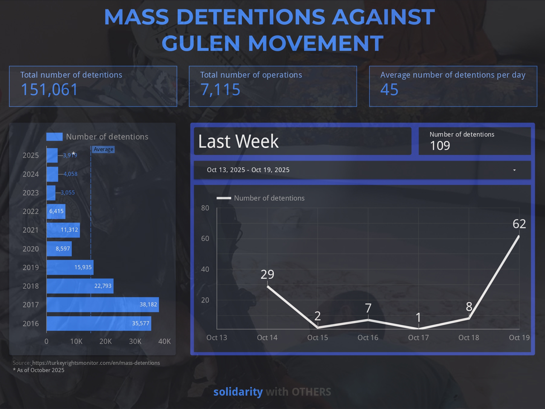 Hafta boyunca savcılar en az 109 kişi hakkında Gülen hareketiyle irtibatlı oldukları gerekçesiyle gözaltı kararı verdi. Birleşmiş Milletler Keyfi Tutuklama Çalışma Grubu (WGAD) tarafından Ekim 2020’de yayımlanan bir görüş belgesinde söz konusu grupla bağlantılı olduğu iddia edilen kişilerin geniş çaplı ve sistematik olarak hürriyetinden mahrum bırakılmasının insanlığa karşı suç teşkil edebileceği belirtildi. Derneğimiz 15 Temmuz darbe girişiminden bu yana gerçekleşen Gülen hareketi bağlantılı toplu gözaltı uygulamalarını detaylı bir veritabanı vasıtasıyla sistematik olarak kayda geçirmektedir.