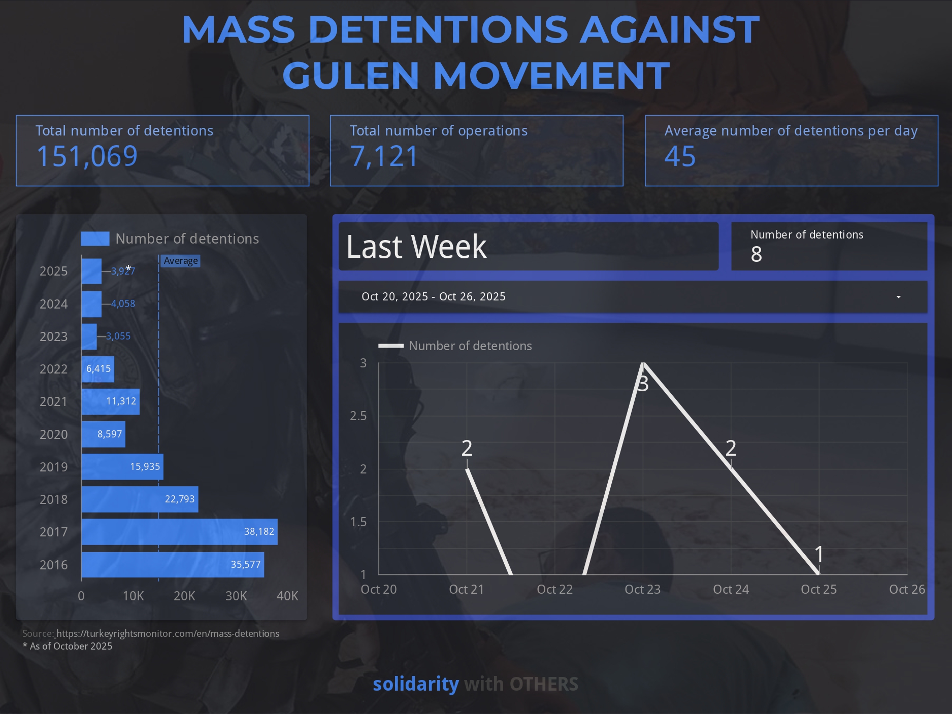 Hafta boyunca savcılar en az 8 kişi hakkında Gülen hareketiyle irtibatlı oldukları gerekçesiyle gözaltı kararı verdi. Birleşmiş Milletler Keyfi Tutuklama Çalışma Grubu (WGAD) tarafından Ekim 2020’de yayımlanan bir görüş belgesinde söz konusu grupla bağlantılı olduğu iddia edilen kişilerin geniş çaplı ve sistematik olarak hürriyetinden mahrum bırakılmasının insanlığa karşı suç teşkil edebileceği belirtildi. Derneğimiz 15 Temmuz darbe girişiminden bu yana gerçekleşen Gülen hareketi bağlantılı toplu gözaltı uygulamalarını detaylı bir veritabanı vasıtasıyla sistematik olarak kayda geçirmektedir.