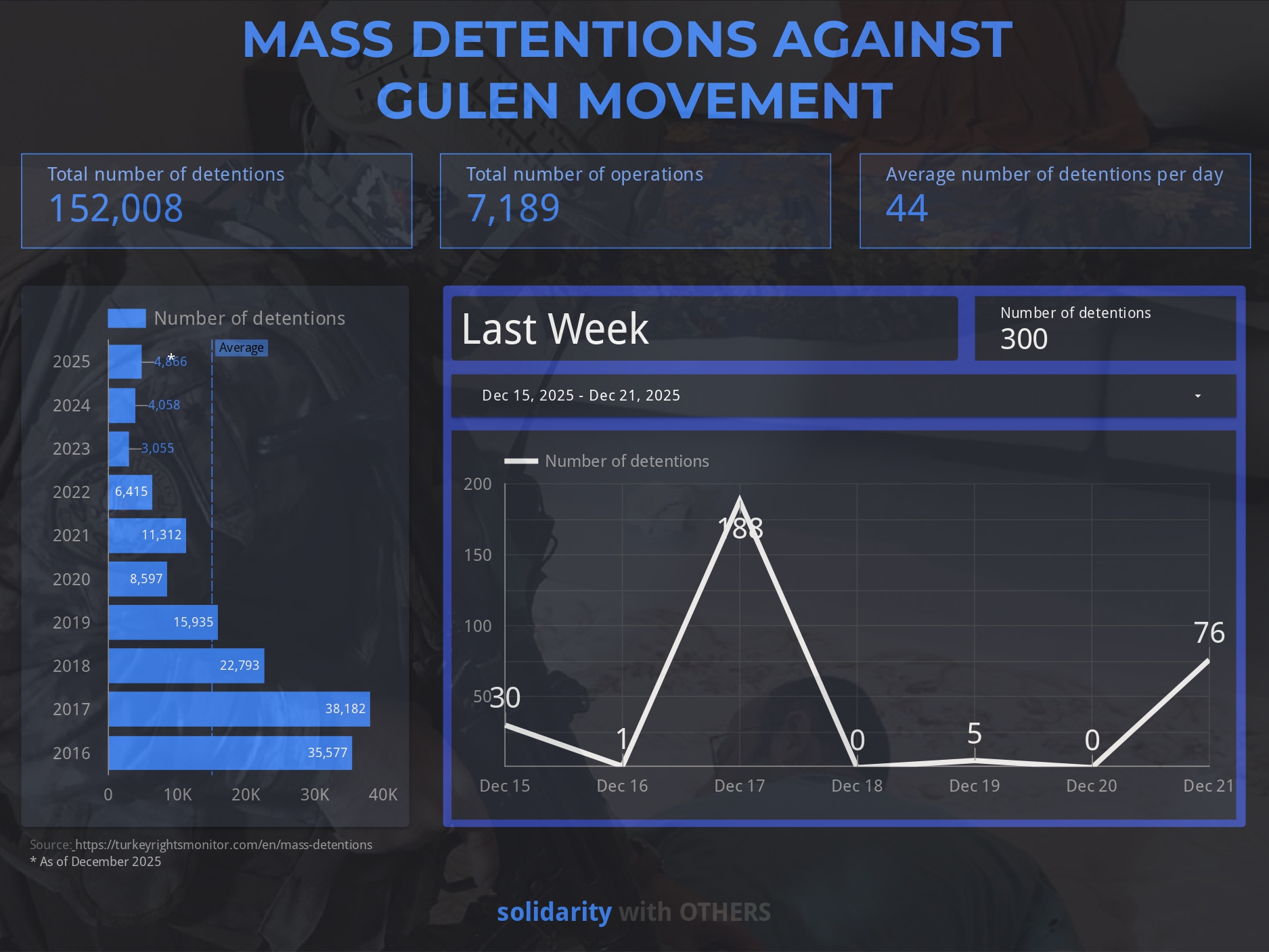 17 Aralık: İçişleri Bakanı Ali Yerlikaya, son iki haftada Gülen hareketiyle bağlantılı oldukları iddiasıyla 39 ilde düzenlenen operasyonlarda 160 kişinin gözaltına alındığını açıkladı; suçlamalar arasında, Avrupa İnsan Hakları Mahkemesi’nin defalarca suç teşkil etmediğine hükmetmesine rağmen ankesörlü telefon aramaları ve ByLock uygulamasının kullanımı da yer aldı.