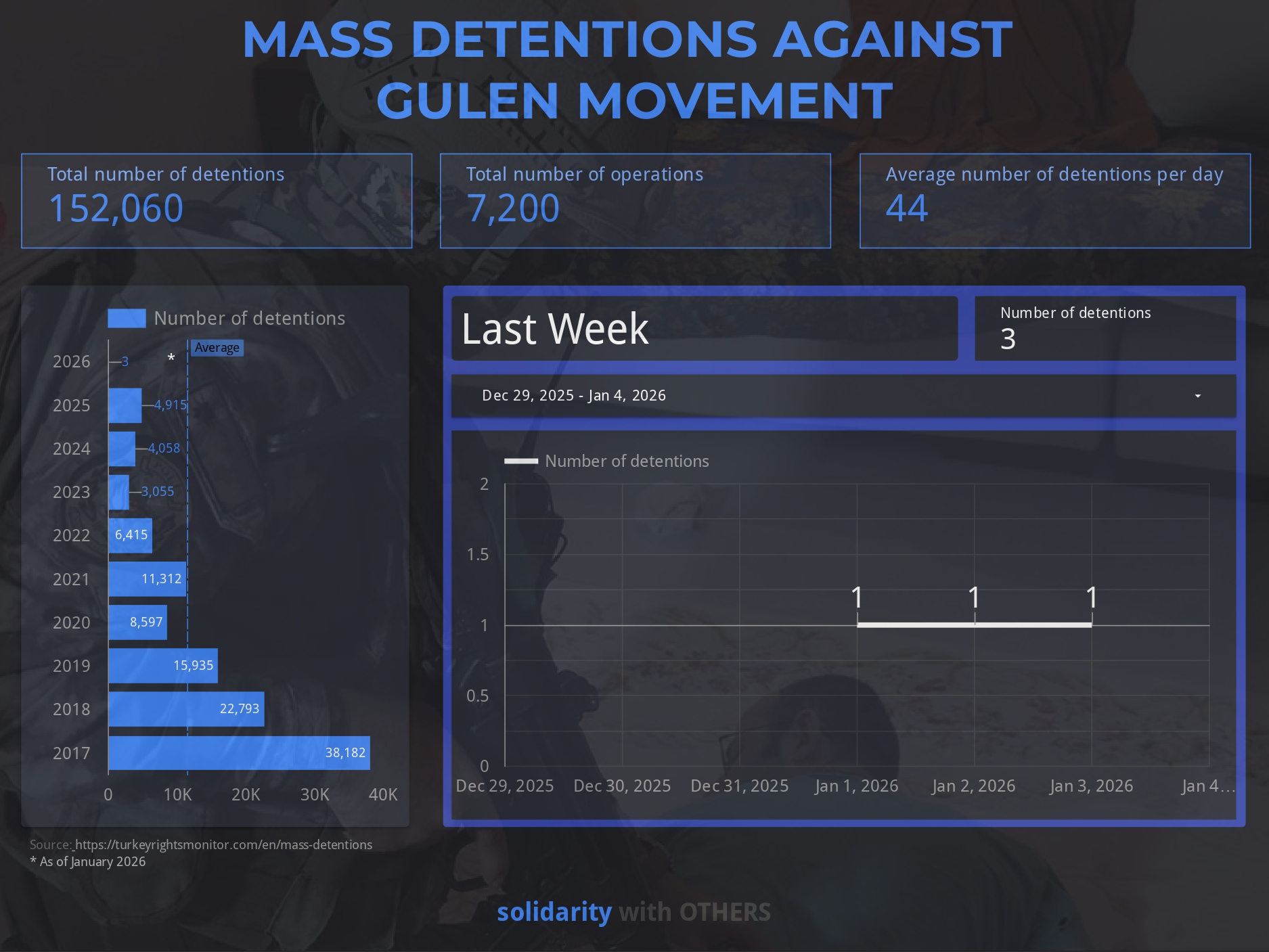 Hafta boyunca savcılar en az 3 kişi hakkında Gülen hareketiyle irtibatlı oldukları gerekçesiyle gözaltı kararı verdi. Birleşmiş Milletler Keyfi Tutuklama Çalışma Grubu (WGAD) tarafından Ekim 2020’de yayımlanan bir görüş belgesinde söz konusu grupla bağlantılı olduğu iddia edilen kişilerin geniş çaplı ve sistematik olarak hürriyetinden mahrum bırakılmasının insanlığa karşı suç teşkil edebileceği belirtildi. Derneğimiz 15 Temmuz darbe girişiminden bu yana gerçekleşen Gülen hareketi bağlantılı toplu gözaltı uygulamalarını detaylı bir veritabanı vasıtasıyla sistematik olarak kayda geçirmektedir.